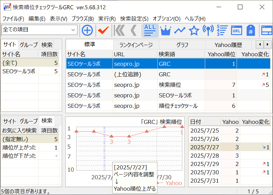 メモ機能を使ってウェブページの修正内容を適時記録しておくと、その後の検索順位の変化と合わせて分析することができます。 上位表示のノウハウを蓄積する手がかりになります。
